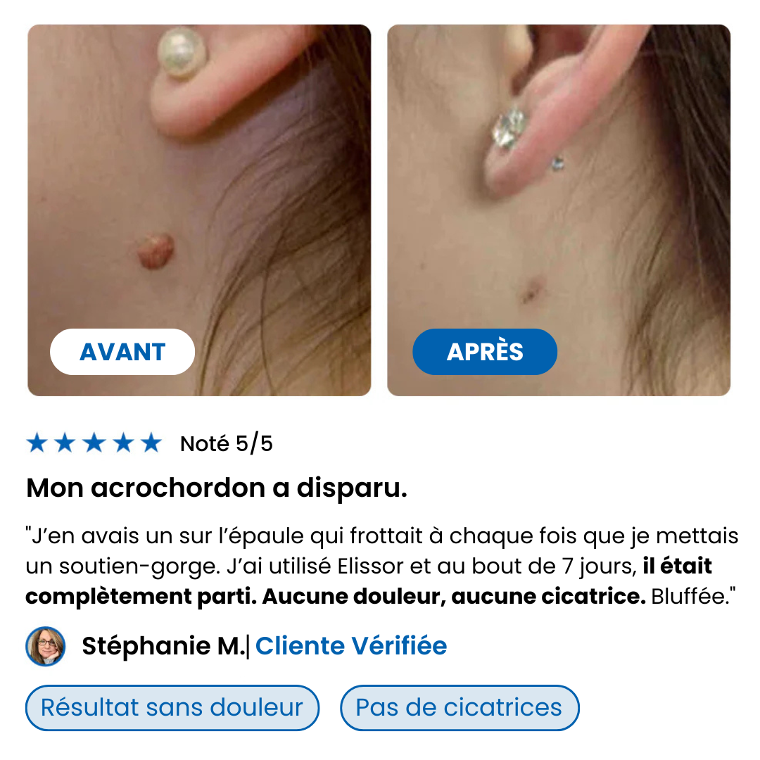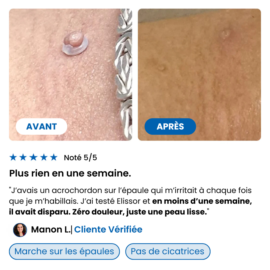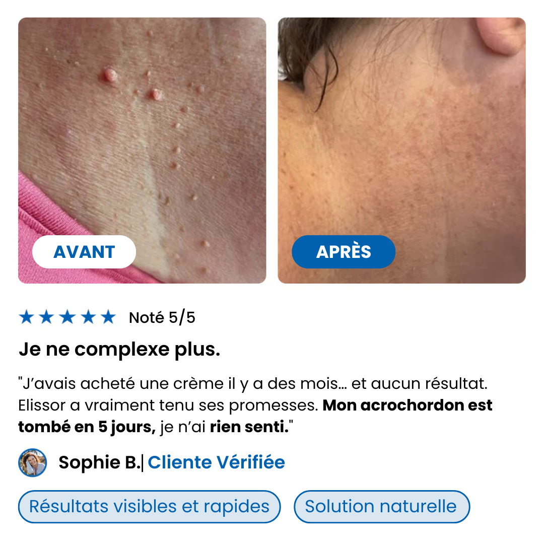 Elissor™ Pro élimine vos acrochordons, verrues et taches cutanées en quelques jours, sans douleur ni cicatrice.